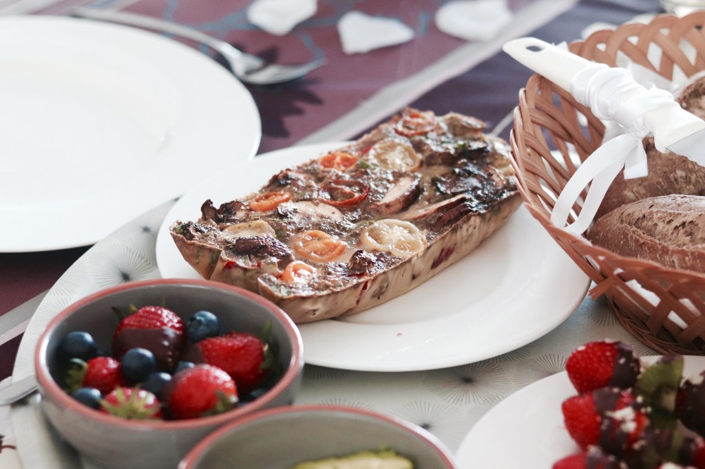 Baking an egg-quiche is quite simple, and a convenient way to serve a lot of veggies to people without them realizing it. The combination of great flavors & texture does the trick. What I used: 4 eggs, a dash of milk, mushrooms, bell pepper, cherry tomatoes, fresh parsley and Italian herbs. I baked the veggies for 3-4 min. and mixed the other ingredients in a bowl. After that, I put all ingredients together in a small baking dish and let the quiche bake in the oven for about 40 min (180C). Super easy, and very tasty!